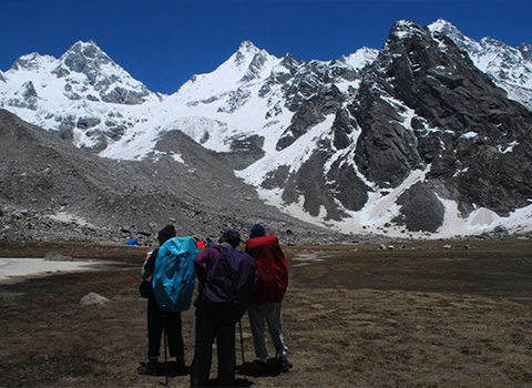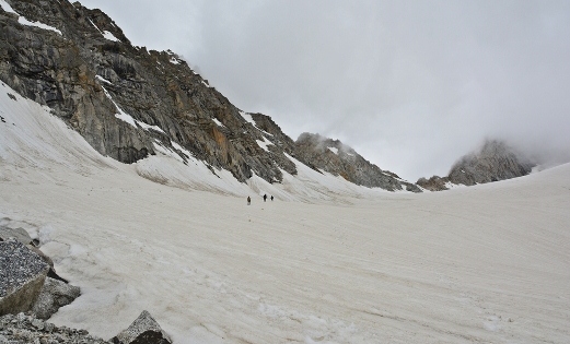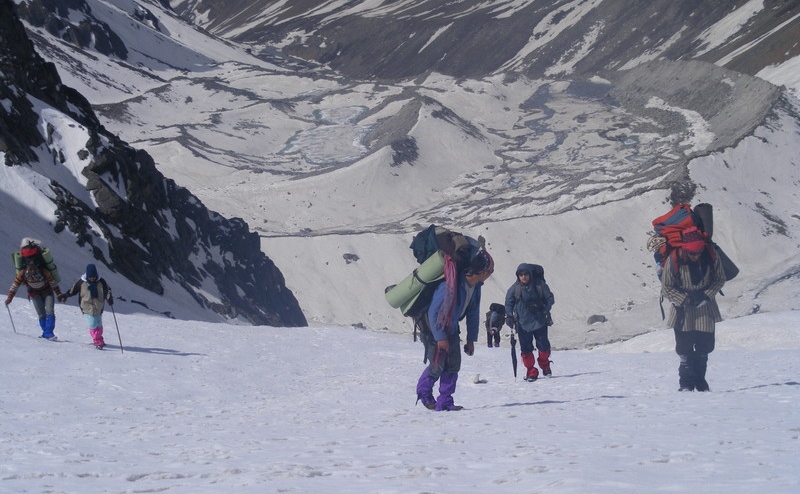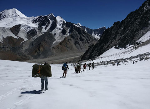 Morning Breakfast at the Camp then Start Trek 2km. Pass Crossing: early the morning 6/7am.Cross pass early at about 3,366 and get down to the Lamjunga Glacier side Long walk downhill for about 5Kms to reach Bunga Glacier walk in steadily dropping Altitude. Dinner & overnight at the camp Bonga.