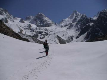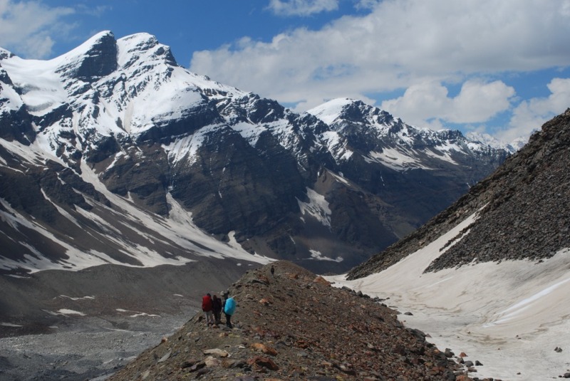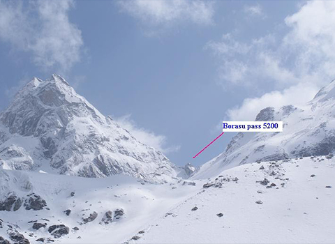 After breakfast start pass to borasu You need to start as early as possible. You can see golden peaks on your left as the sun’s first ray shines upon them. Looking behind you can see blue skies, snow-capped peaks, beautiful green valley, Borasu glacier, and Saunbhera campsite down below. Start walking on the gradual snow slope in the direction of the pass. Within 5 – 10 minutes, you come across some boulders surrounded by snow; the trail passes between the boulders.