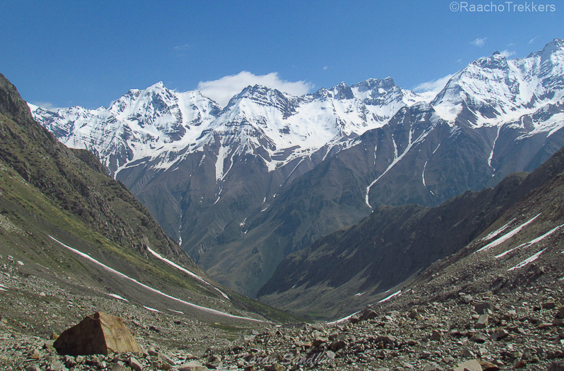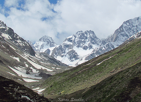 Take the trail that passes through boulders and climbs down to reach the waters of Borasu Glacier. Borasu pass and peaks are visible all along the trail. Continue on the muddy trail, keeping the waterbed to the right. The trail passes through grassy meadows avoiding the slush on the edge of the water body. In around 10 -15 minutes, you come across a stream. Cross the stream and continue on the flat meadow.