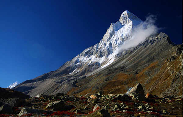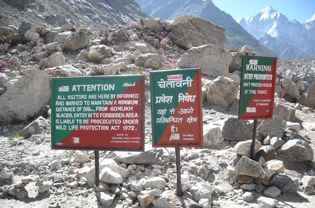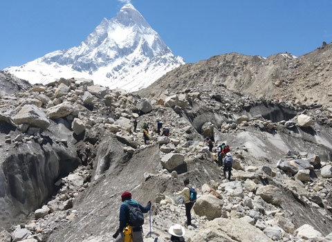 The trek from Gaumukh to Tapovan is a steep ascent over the side of the glacier, and as one climbs, the view of the surrounding peaks becomes clearer. It is particularly auspicious to take a dip at the Source of the Holy Ganges. Then trek to Tapovan (Altitude 4500m), "the Abode of the Gods". The trail is passing over the Glacier over Gaumukh.