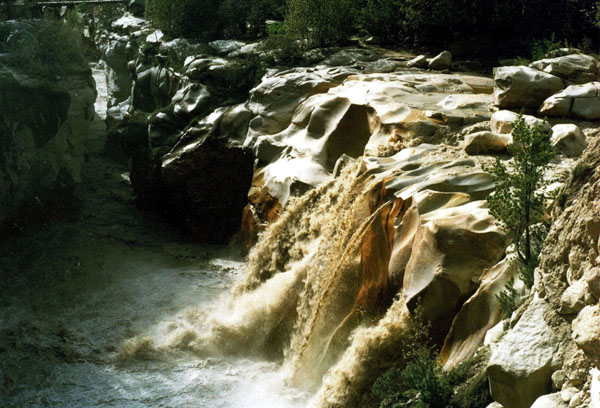 Gangotri : The shrine of Gangotri is situated at an elevation of 3200 m surrounded by Deodars (Cider) and Chir (pine). The original temple was constructed by the Gorkha General Amar Singh Thapa after his conquest of the Garhwal area! Every year people from all around the world visit this shrine. A number of Ashrams and Dharamshalas are located on the far side of the river. It is believed that Raja Bhagirath used to worship Shiva on a slab of rock "Bhagirath Shila" situated near the temple. Submerged in the river there is a natural Shivling where, according to mythology, Lord Shiva sat when he received the Goddess Ganga in his matted locks. A days trek takes one to Gaumukh, the source of the mighty Ganges.