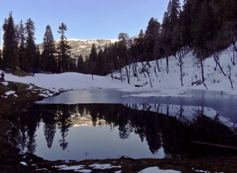 After having a healthy breakfast the trek starts toward Juda Ka Talab,moving out of Sankri village through an extension called Sor.Once you cross the village the road climbs sharply towards Kedarkantha road.You will be climbing and crossing several bridges witnessing exquisite view.One can encounter Himalyan Langoors jumoing from one tree to another.Crossing few streams and dense oaks you will reach beautiful Juda Ka Talab which is an apt and perfect destination to spend a perfect evening.Explore the area at your best,you will be served with snacks and dinner. at the campsite.Overnite sleep in the tents.